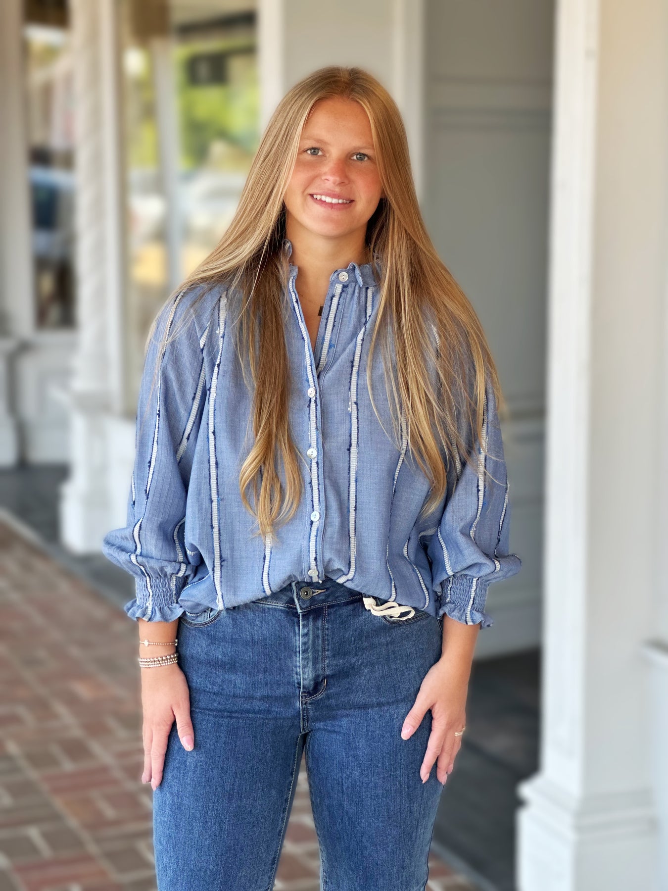 Ruched blue stripe poplin shirt with a ruffle neckline and 3/4 blouson sleeves