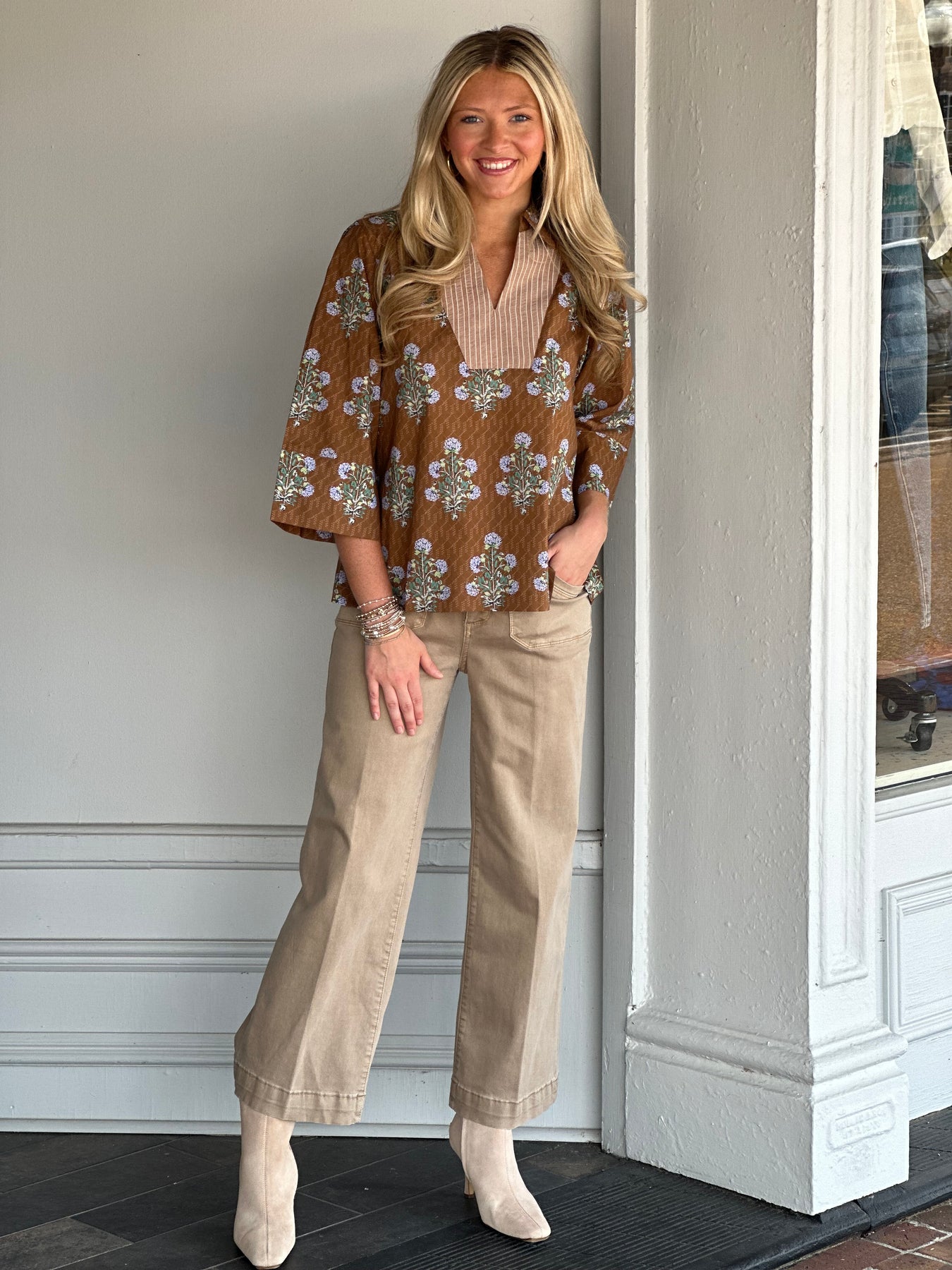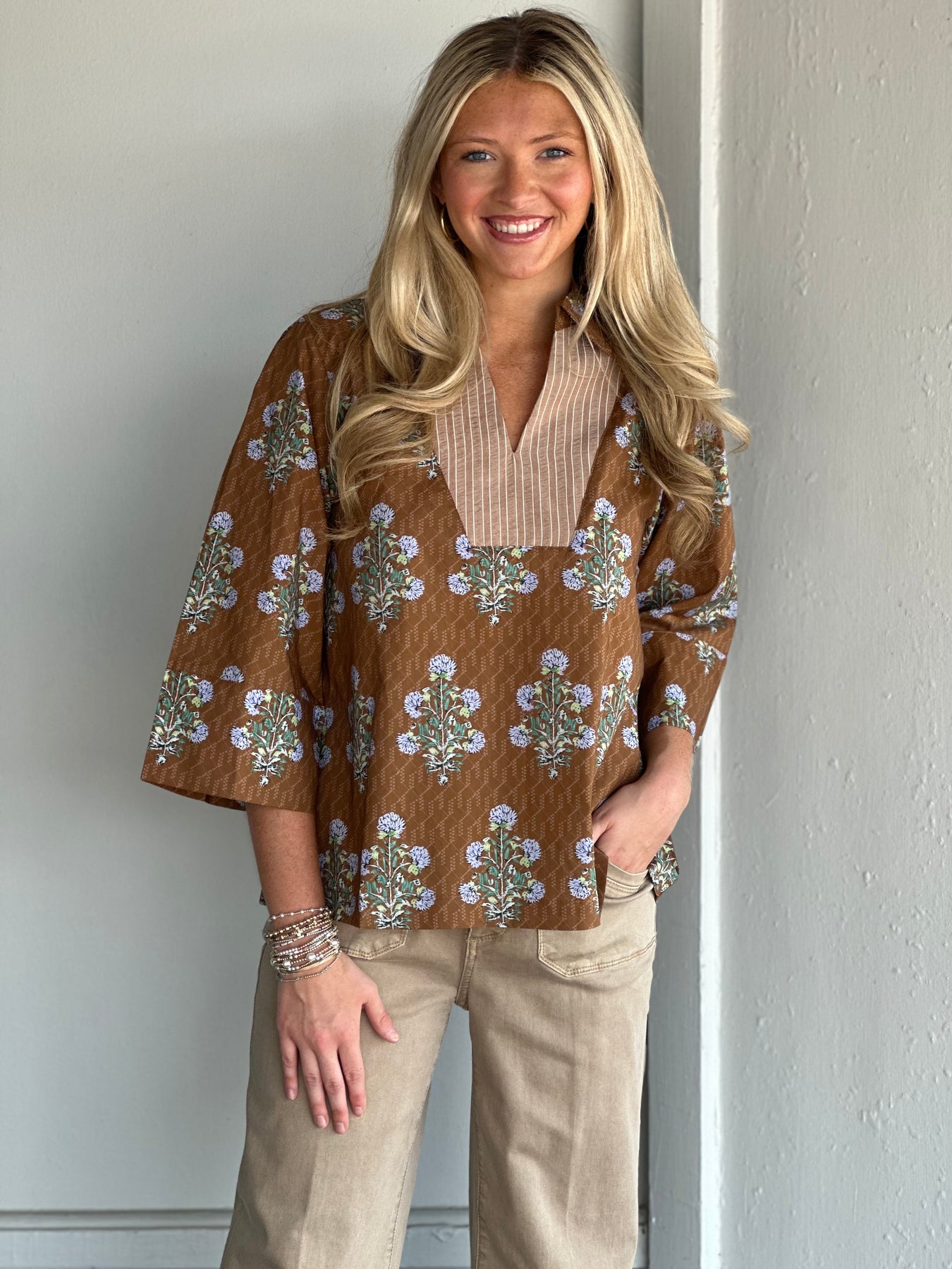 3/4 sleeves floral top with stripe contrast, collared v neckline.
