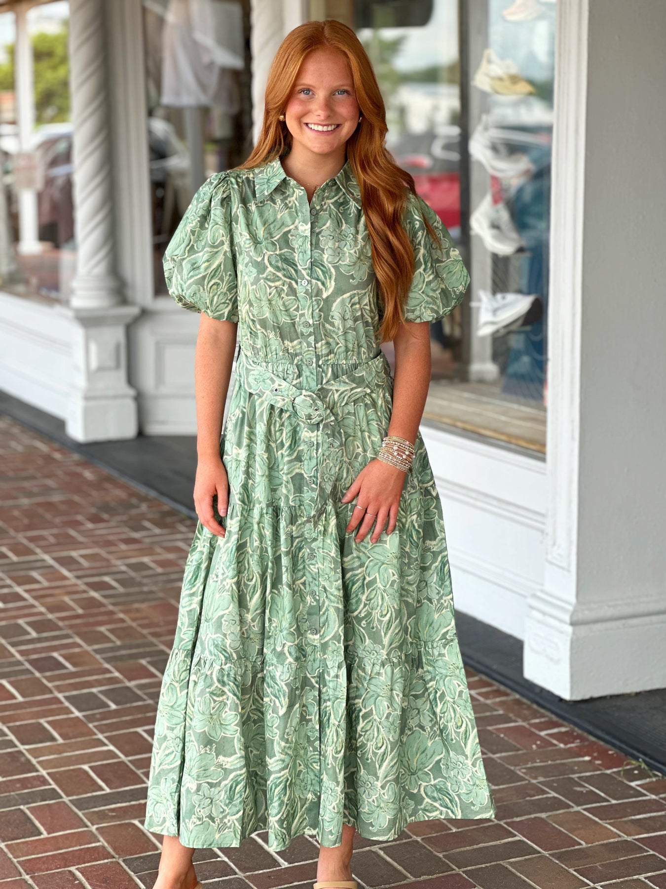 Floral print short bubble sleeve collar button front tiered midi dress. Elasticated waist with removable self-belt. Pockets at sides. Lined. Woven. Non-sheer. Lightweight.