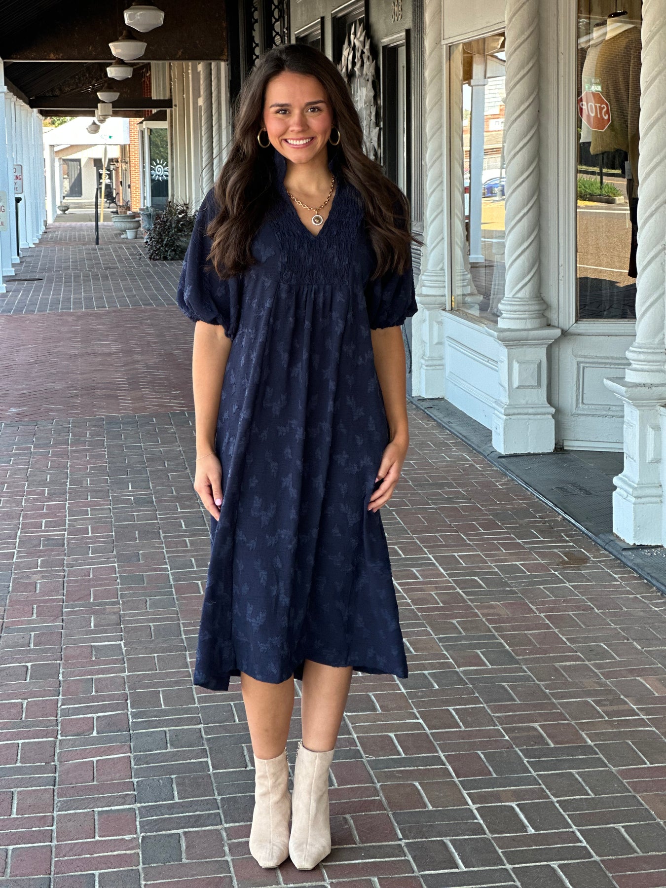 Jacquard Smocked Midi Dress in Navy