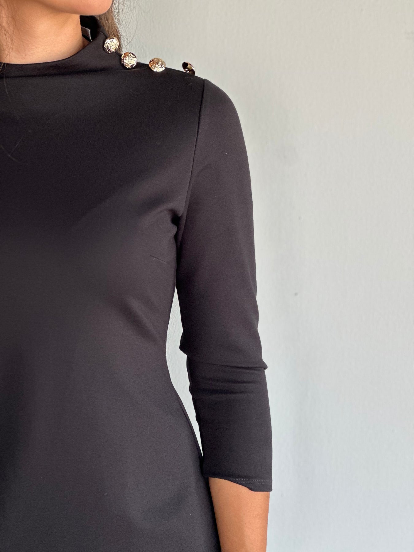 Introducing Gertie! This new sheath silhouette dress is a must-have for the season. Designed with a sleek funnel neckline and long sleeves, it's elevated by gold button details at the shoulder for a touch of sophistication. Effortlessly versatile and chic, this dress transitions seamlessly from desk to dinner.