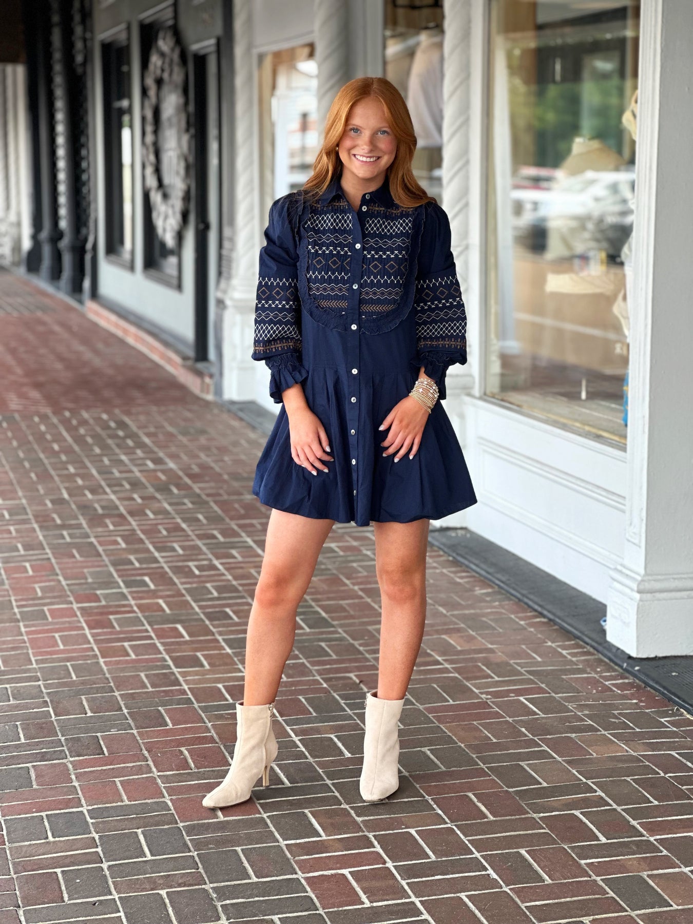 The Walton Dress features intricate embroidery, a pleated skirt, contrast picot edge finishing, and long sleeves — an elevated take on the classic shirt dress.