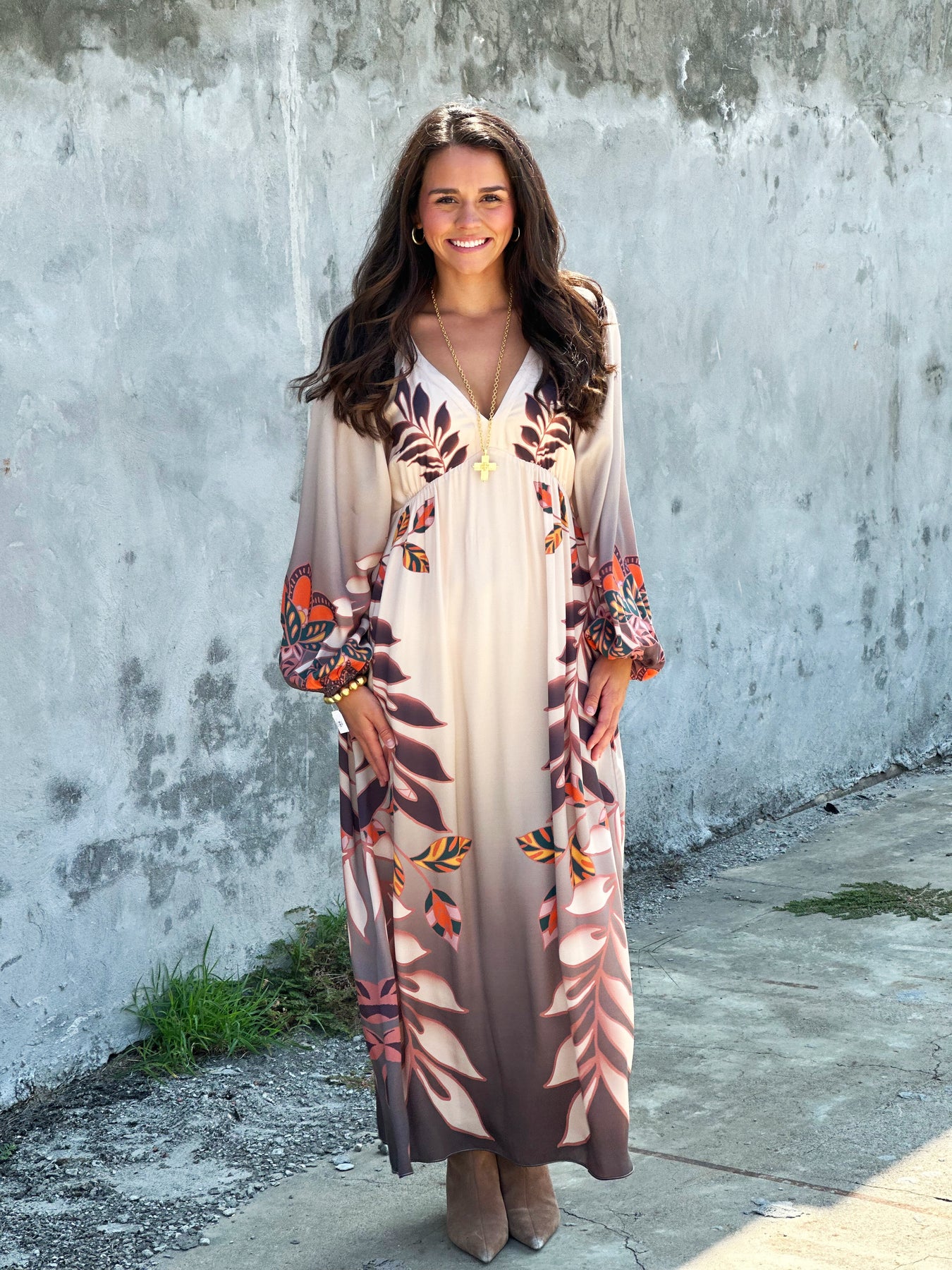 Our Mindy Dress in the Copper Orchard print is crafted from a soft cupro-viscose blend, offering a beautiful drape and luxurious feel. This maxi-length style features a flattering deep V-neckline and an empire waist that gathers gently under the bust, creating a graceful, elongated silhouette.