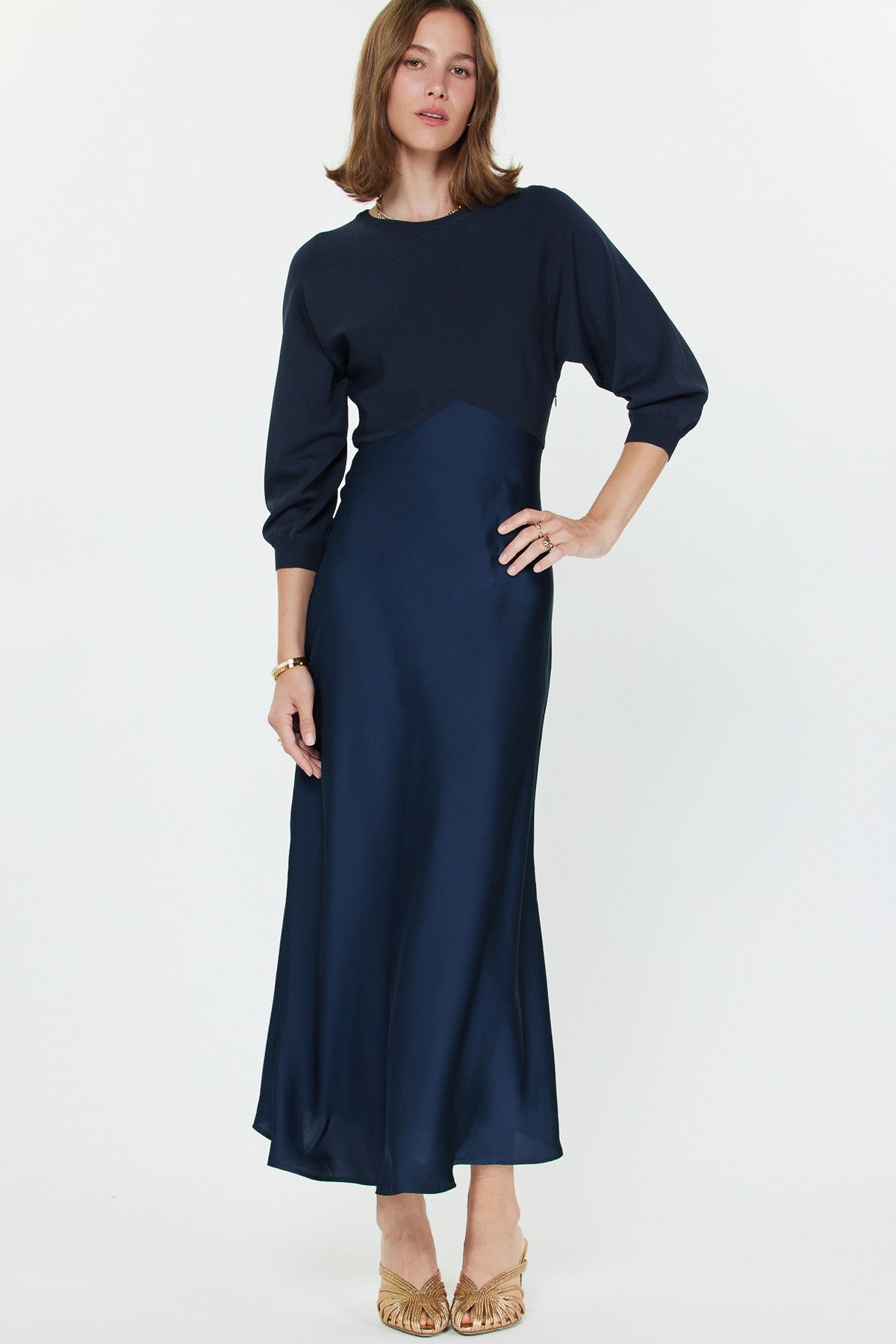 -Mixed media construction: sweater top with woven skirt -Flared midi length skirt -3/4 length sleeves with subtle ribbed cuffs -Clean round neckline -Side invisible zipper