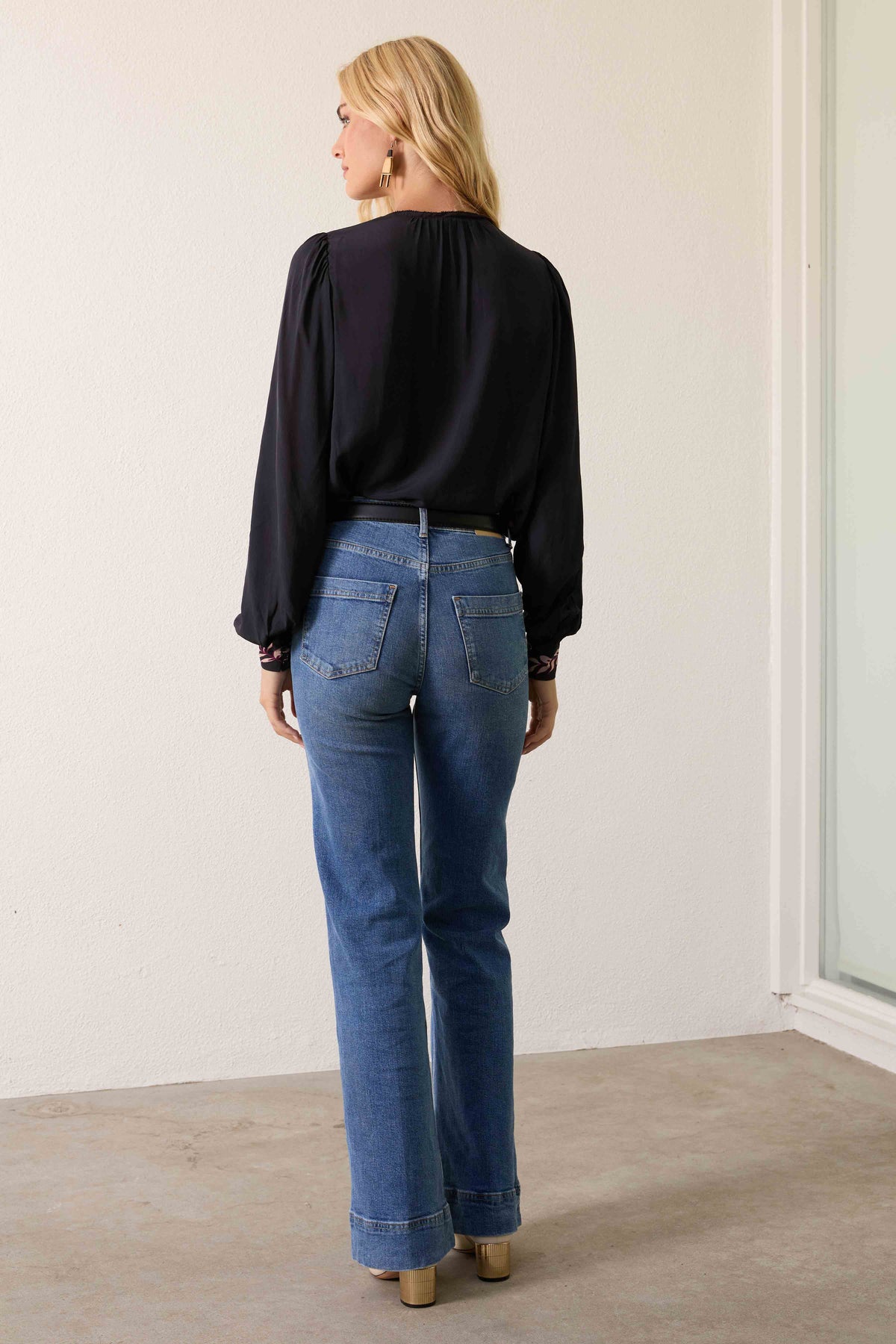 The Ruby Top is a long-sleeve blouse crafted from 100% viscose, offering a soft drape and effortless comfort. Blouson sleeves with buttoned cuffs add a touch of tailored detail to the flowing silhouette, while a flattering V-neckline and gentle shirring at the back neck enhance its relaxed fit.