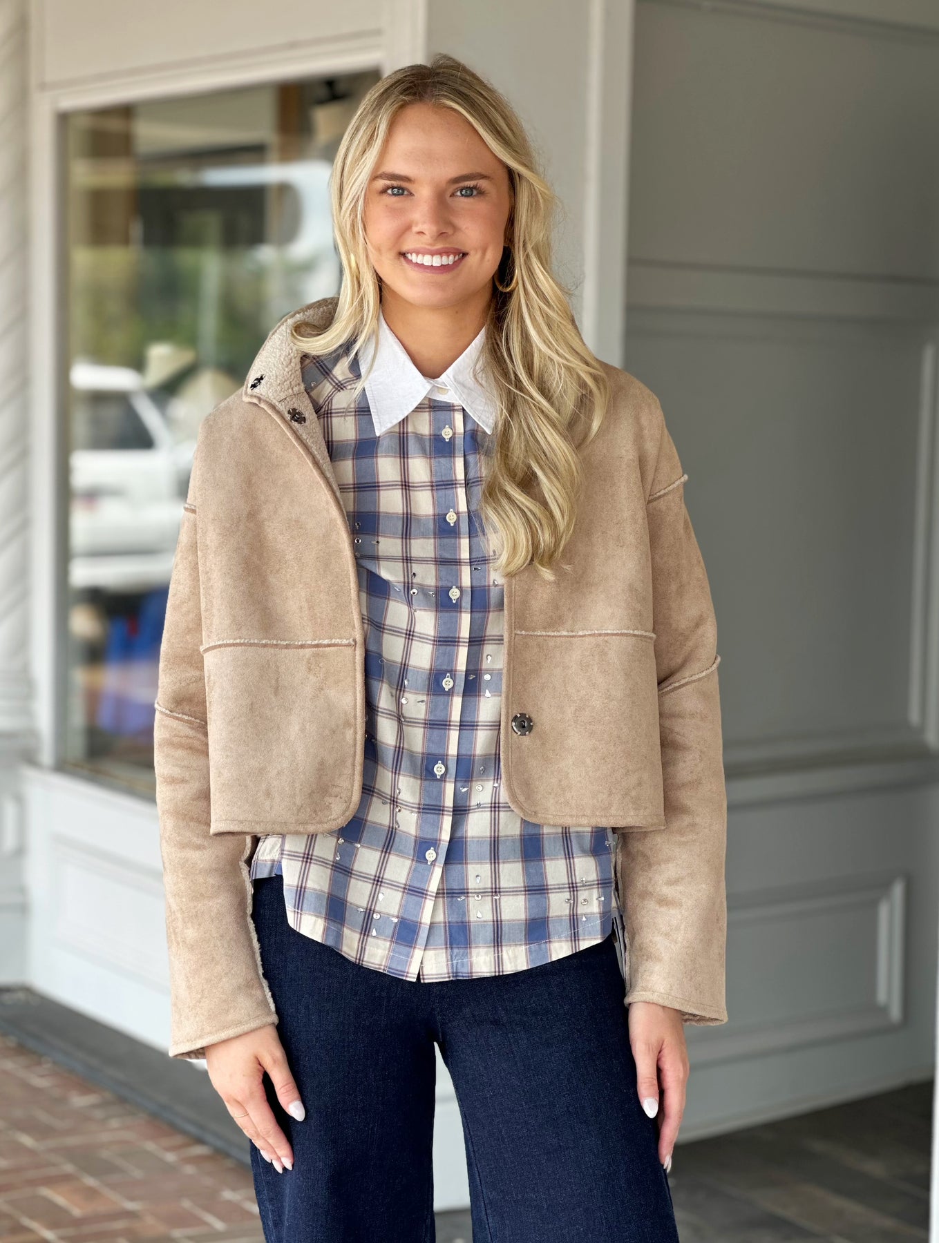 Sherpa Lined Box Cut Button Up Coat in Taupe