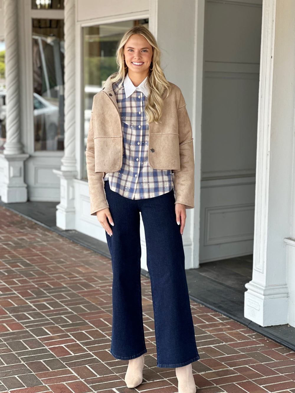 Sherpa Lined Box Cut Button Up Coat in Taupe