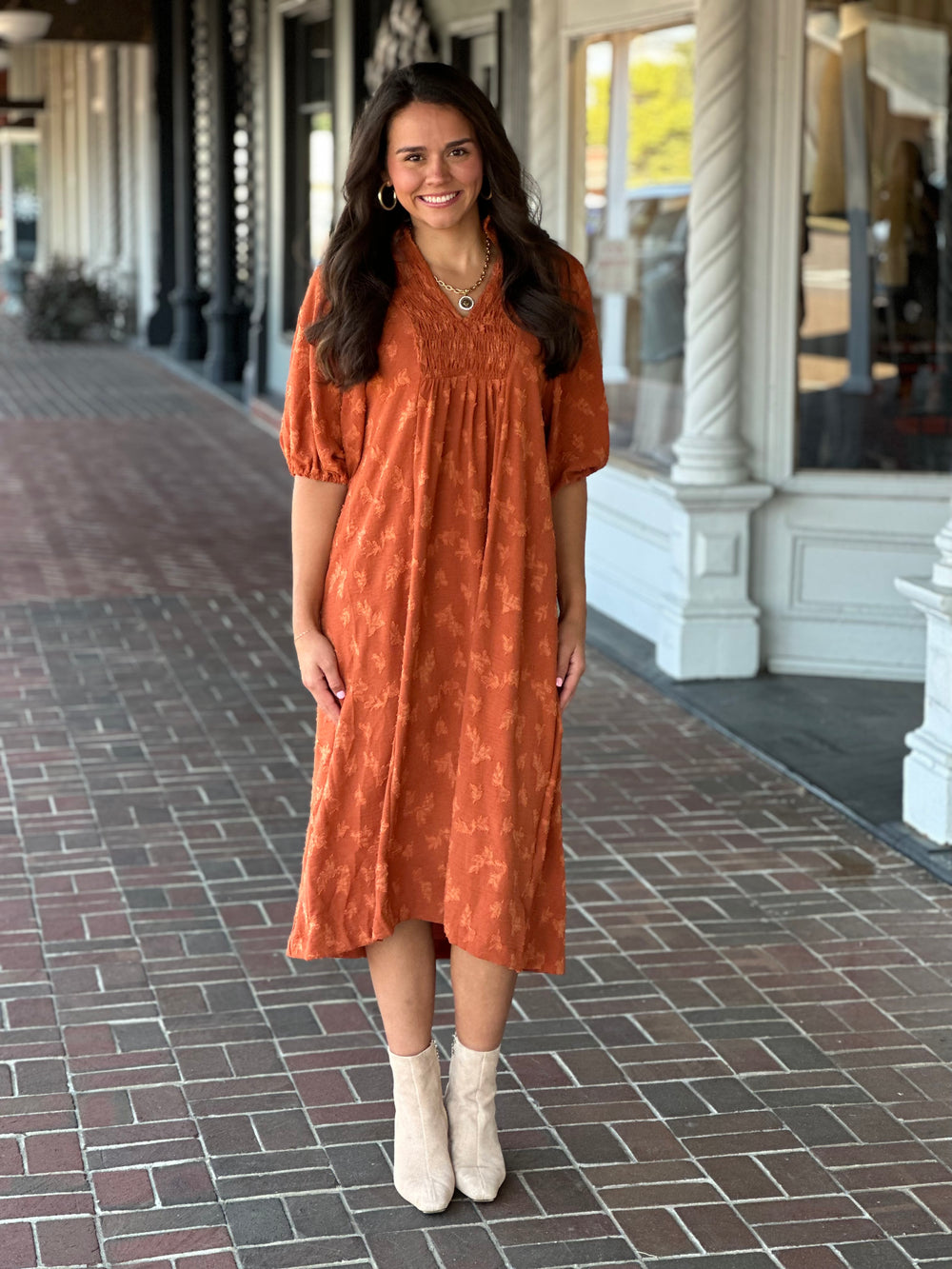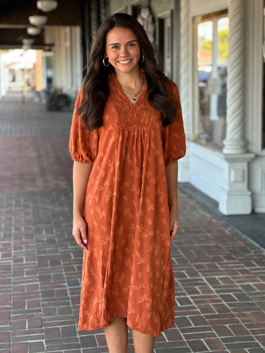 Jacquard Smocked Midi Dress in Rust