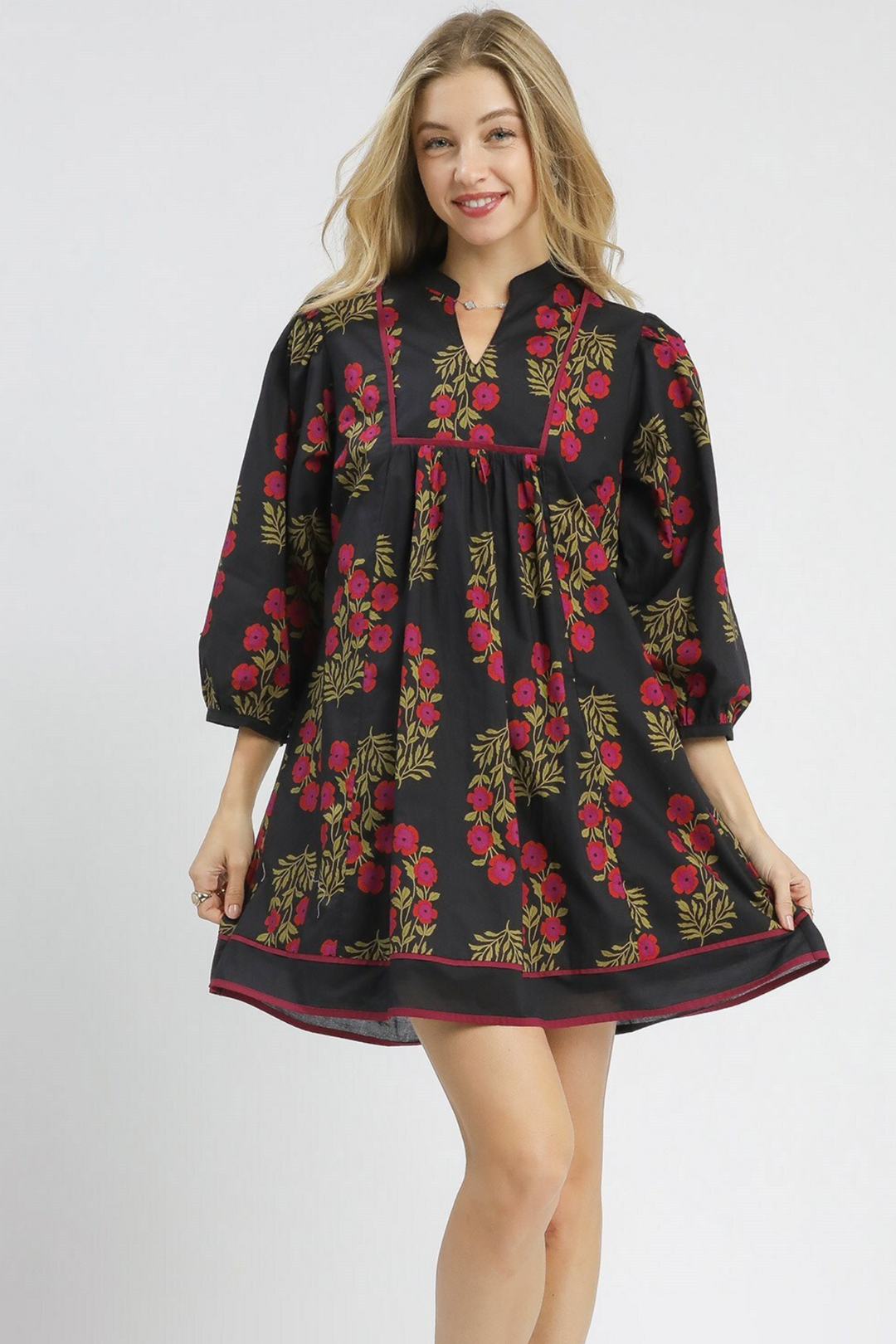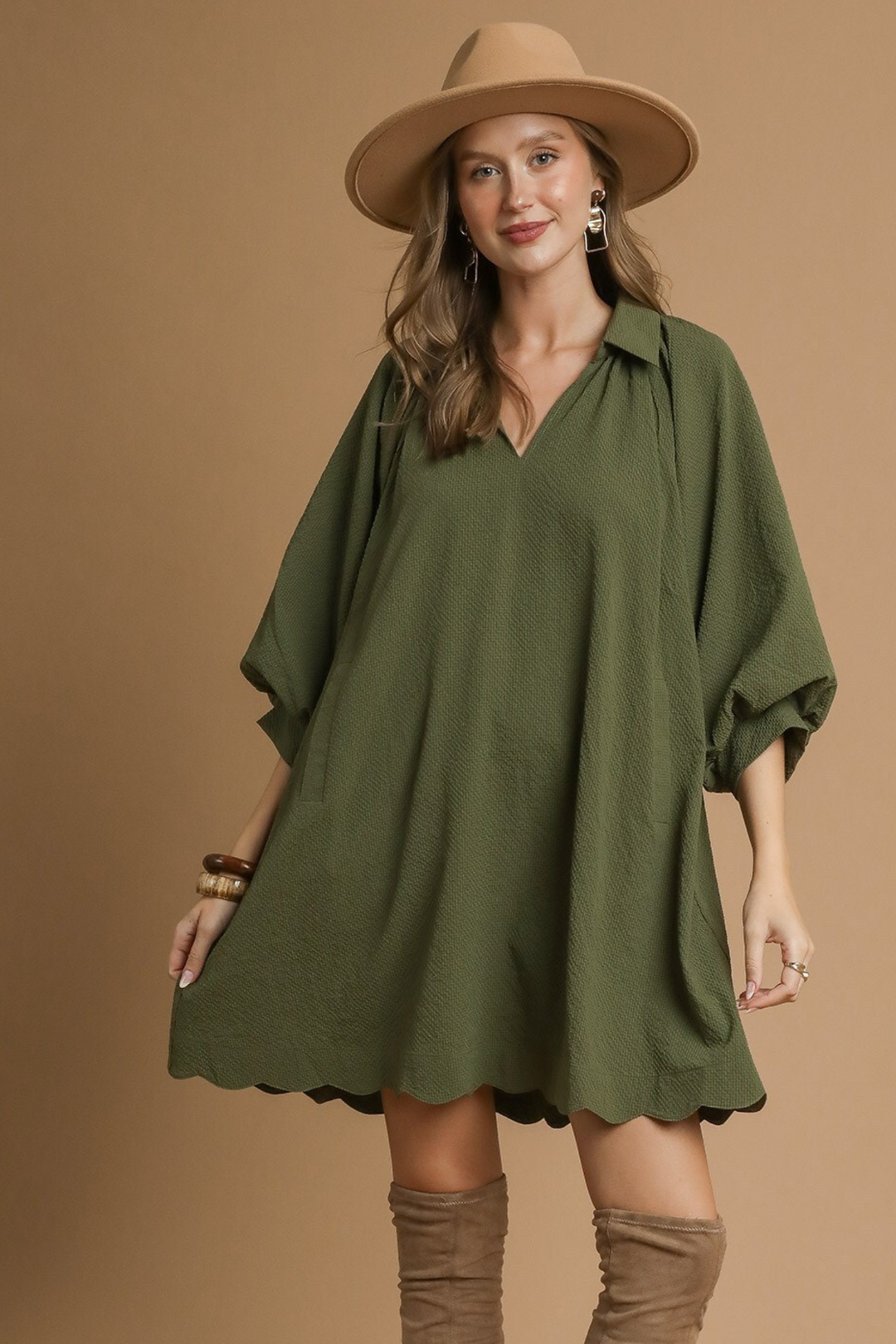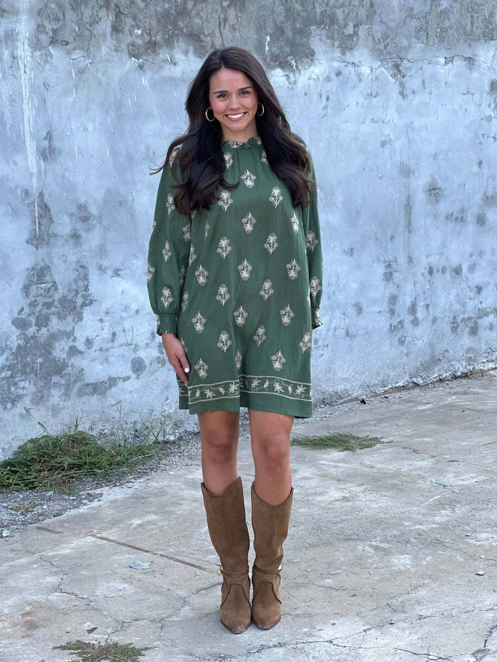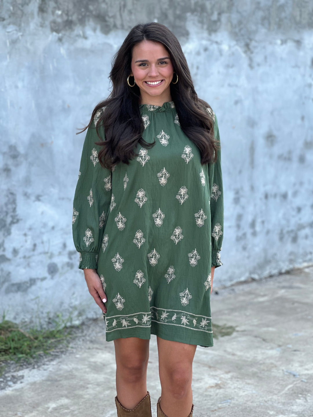 Embroidered Long Sleeve Mini Dress in Pine Green