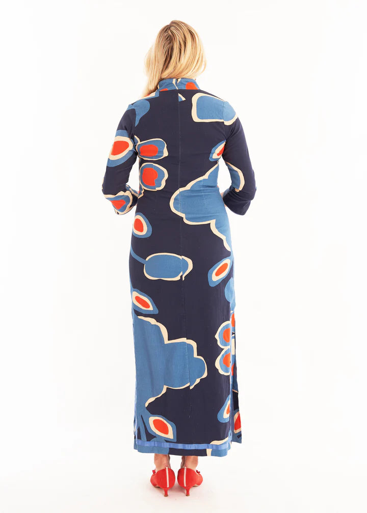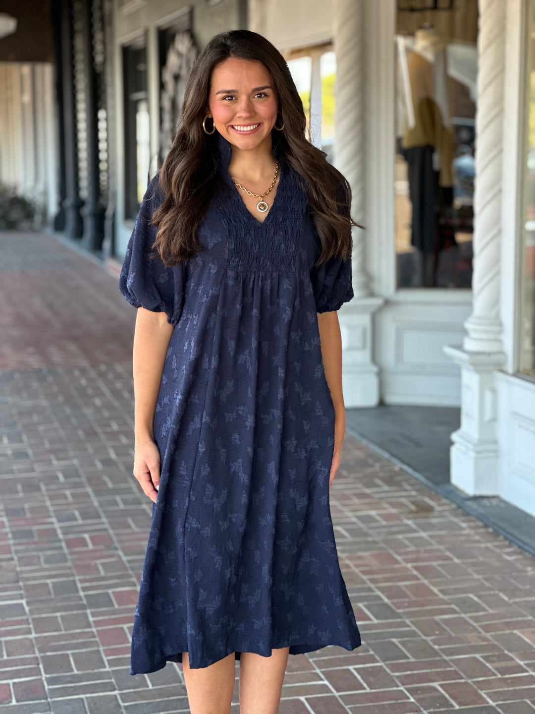 Jacquard Smocked Midi Dress in Navy