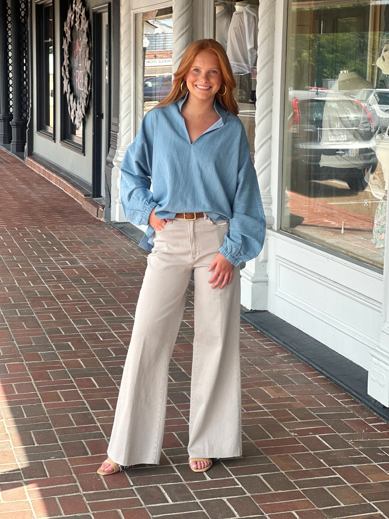 Emily Mccarthy Long Sleeve Poppy Top in Denim Chambray