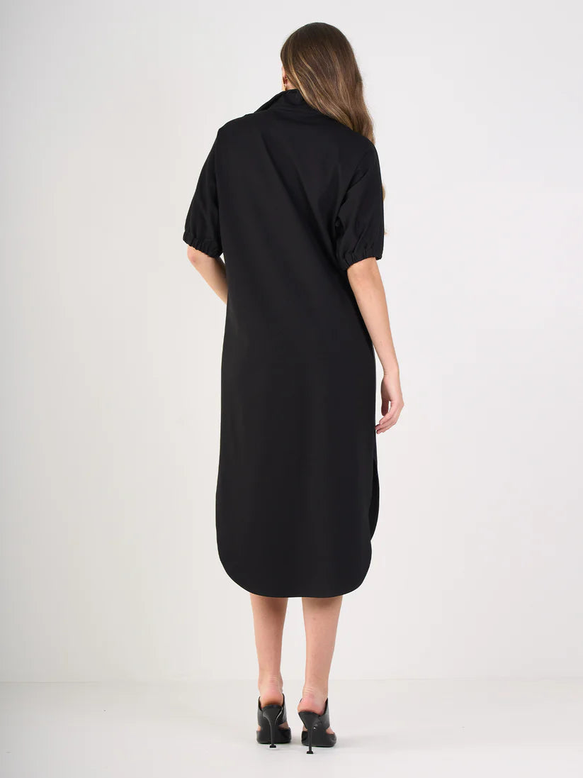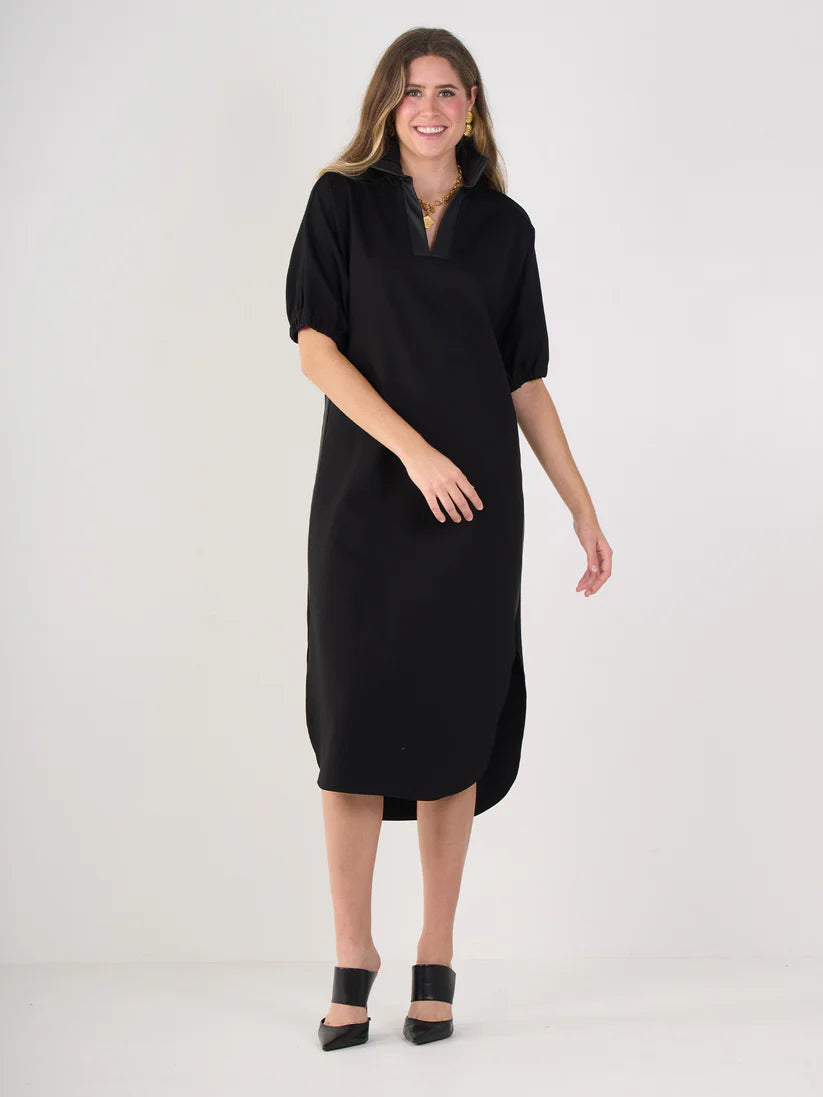 The Poppy Caftan is our best selling silhouette now available in our best selling navy ponte fabric that provides comfortable softness and supportive stretch. The Poppy Caftan is most loved for it's relaxed and effortless silhouette that can easily translate from casual wear to cocktails. Featuring loose elastic dolman sleeves, optional stand collar, and leather trim detailing that leads to a chic curved tail hem.