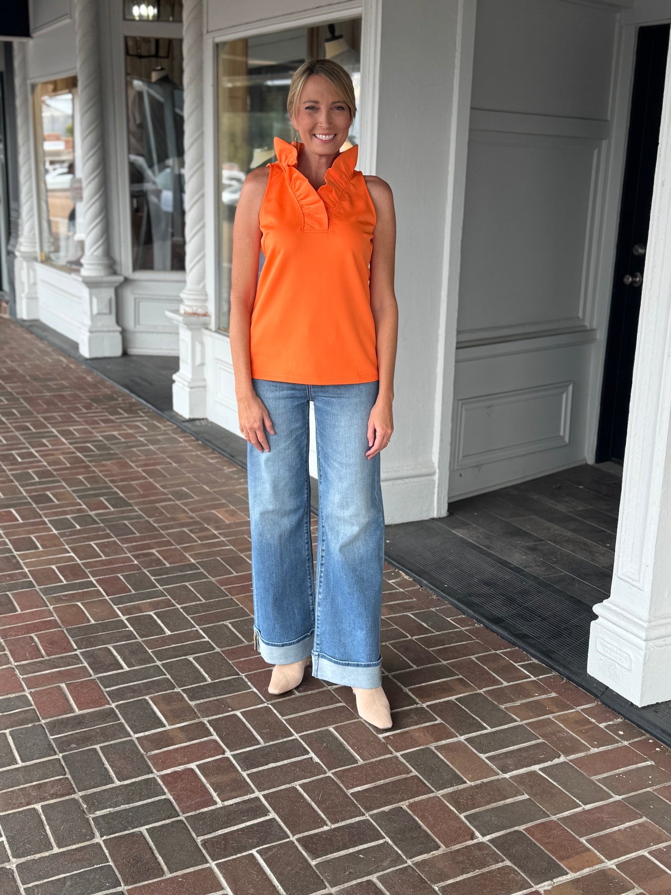 Gretchen Scott Jersey Sleeveless Ruffneck Top in Orange