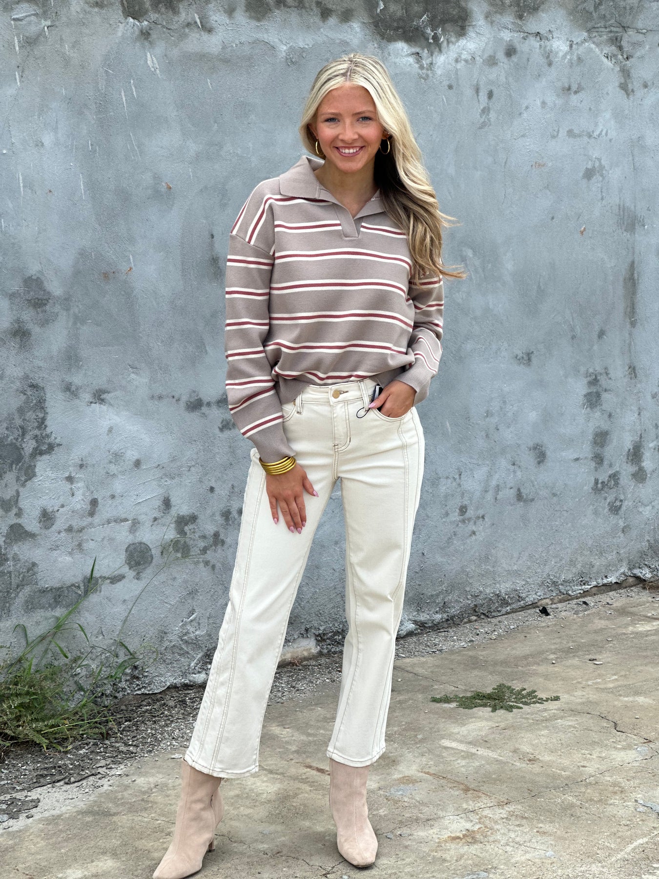 Stripe Polo Collared Sweater in Mocha