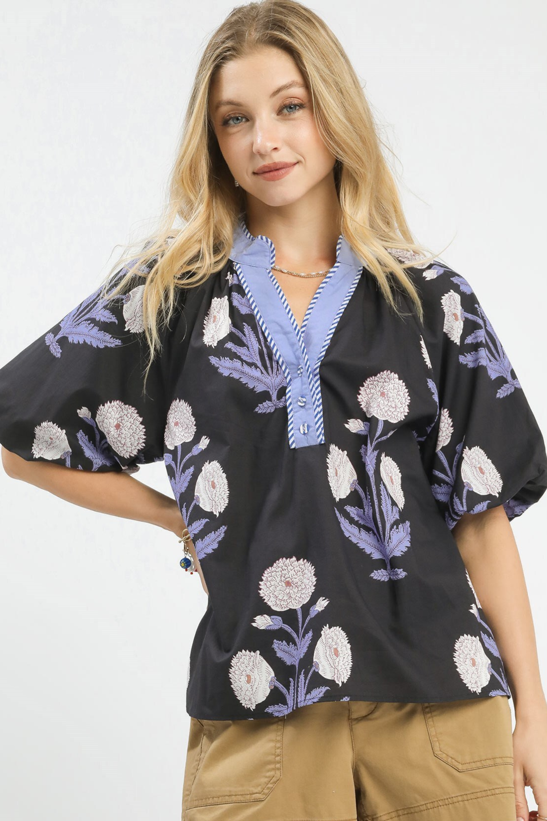 Textured Ruffle Neck Puff Sleeve Blouse in Black